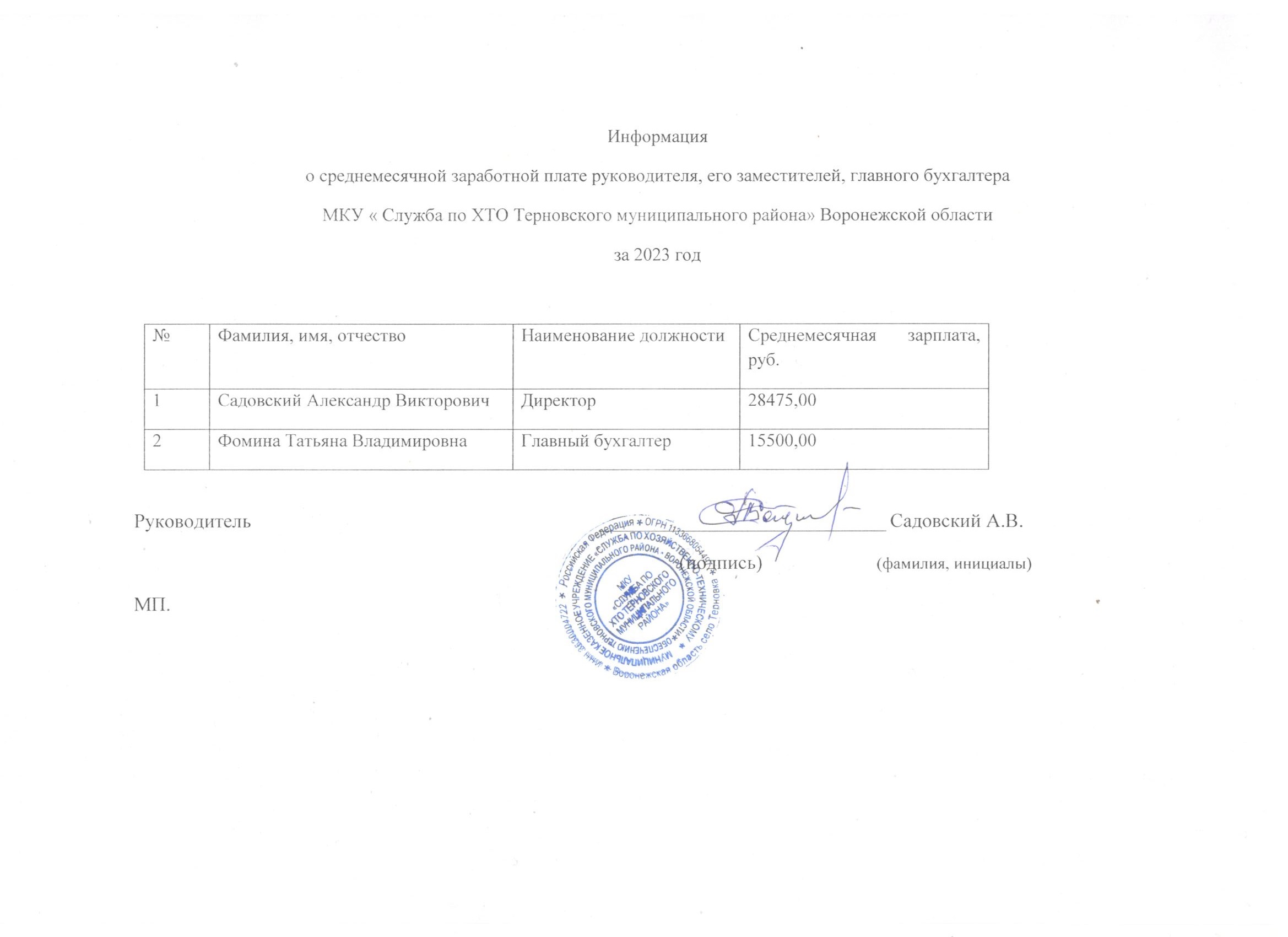 - Информация о среднемесячной заработной плате МКУ "Служба по ХТО Терновского муниципального района" за 2023 год