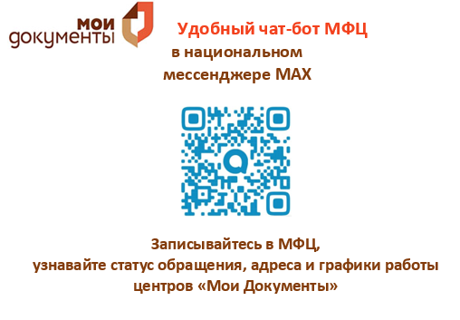 Записаться на получение услуги удобно с помощью чат-бота МФЦ в мессенджере МАХ. Бот предложит доступные слоты, вам нужно только указать услугу и выбрать филиал.